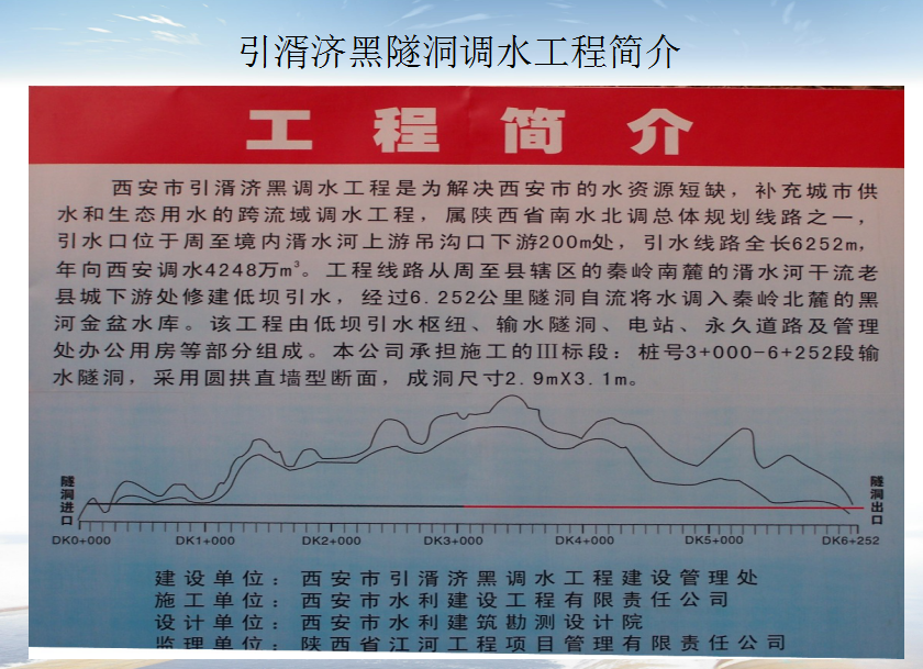 該工程屬陜西省南水北調(diào)總體規(guī)劃線路之一,引水口位于周至境內(nèi)湑水河上游吊溝口下游200m處,引水線路全長6252m,年向西安調(diào)水4248萬m3。由低壩引水樞紐、輸水隧洞、電站、永久道路及管理處辦公用房等部分組成。